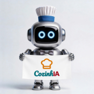 Personagens de desenho animado, uma avó, um chef e um robô, segurando um cartaz do CozinhIA